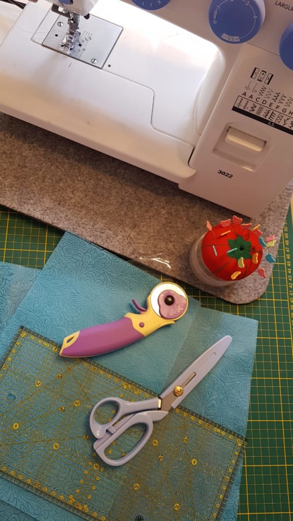 4 – Perceba que após esta etapa você já possui um “saquinho” formado. Para melhorar o acabamento, utilize a régua e um cortador circular para retirar as sobras do tecido. Para cortar as linhas, você pode utilizar tesouras para arremate. A base de corte também é um ótimo item para este momento, porque facilita o corte reto do tecido, além de proteger a superfície contra arranhões permanentes.
