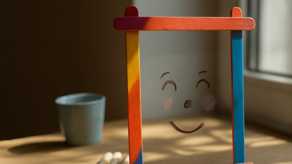 Que tal uma atividade que estimula a observação e a criatividade? Crie uma moldura, como um quadro, usando palitos de sorvete. No lugar do vidro, utilize um pedaço de plástico cristal. As crianças podem segurar a moldura na frente do rosto umas das outras e desenhar os traços e expressões faciais com canetas para quadro branco. É uma forma divertida e artística de se verem e explorarem as diferenças e semelhanças!
