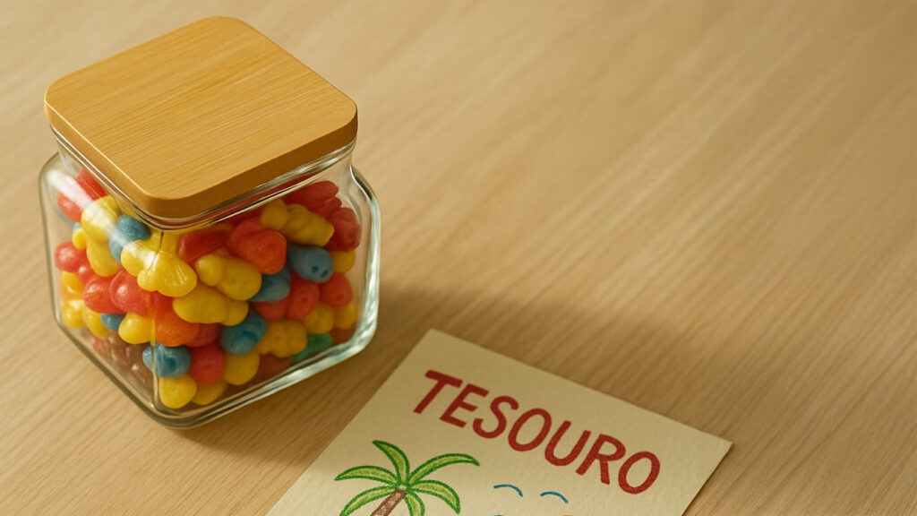 Crie um mapa simples da casa e esconda “tesouros” (pequenos brinquedos, doces ou mensagens) em diferentes cômodos. As pistas podem ser charadas ou desenhos que levem ao próximo local. Os potes de vidro podem ser usados como os “baús do tesouro” finais. Essa atividade estimula o raciocínio lógico, a leitura (para os mais velhos) e a exploração do ambiente de forma lúdica e emocionante.