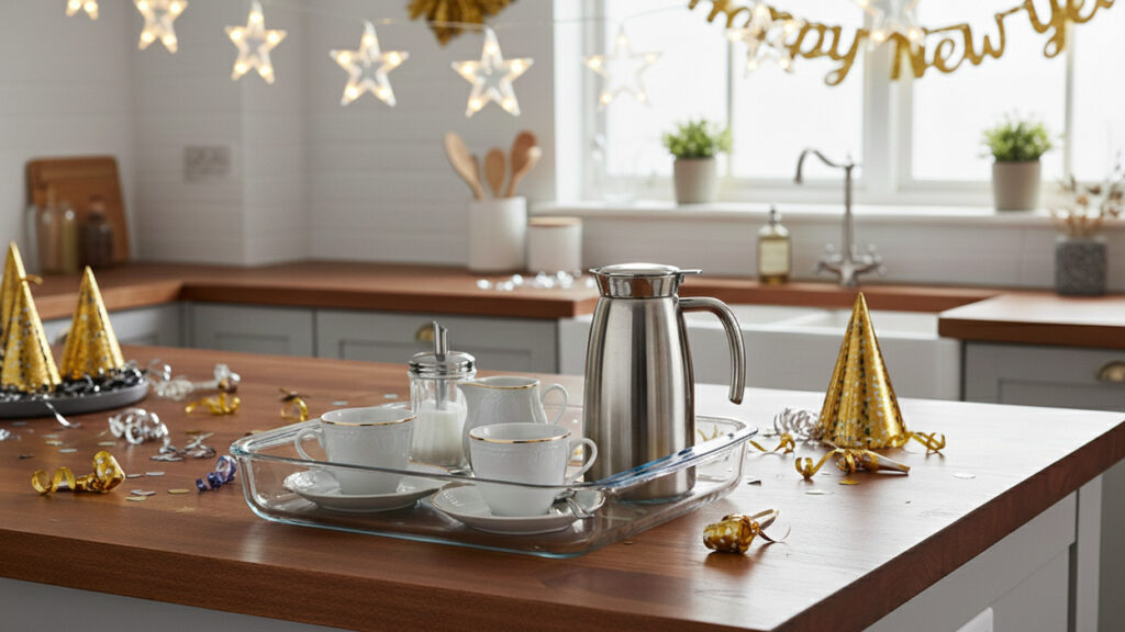 Na cozinha, crie um cantinho do café ou chá especial para receber as visitas de Ano Novo. Use uma travessa como bandeja para organizar xícaras, açucareiro e biscoitos. É funcional e decorativo ao mesmo tempo.